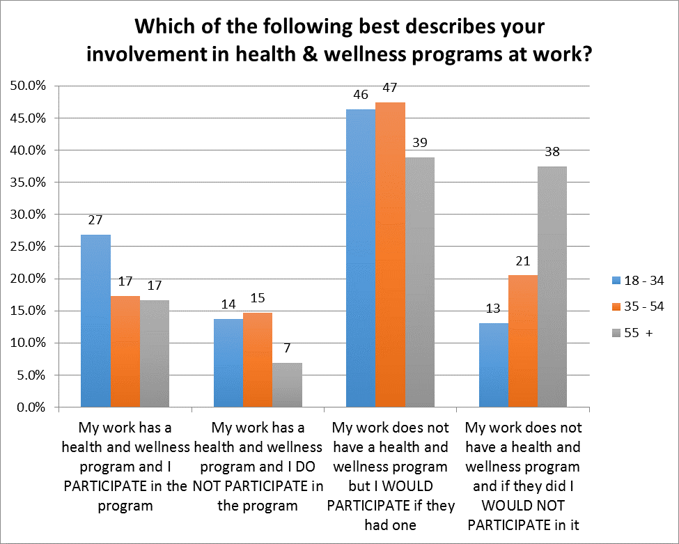 Only 32 percent of those age 35 to 54 and only 24 percent of the 55-plus segments indicated they had a workplace wellness program compared to more than 2 in 5 millennials (18 to 34).